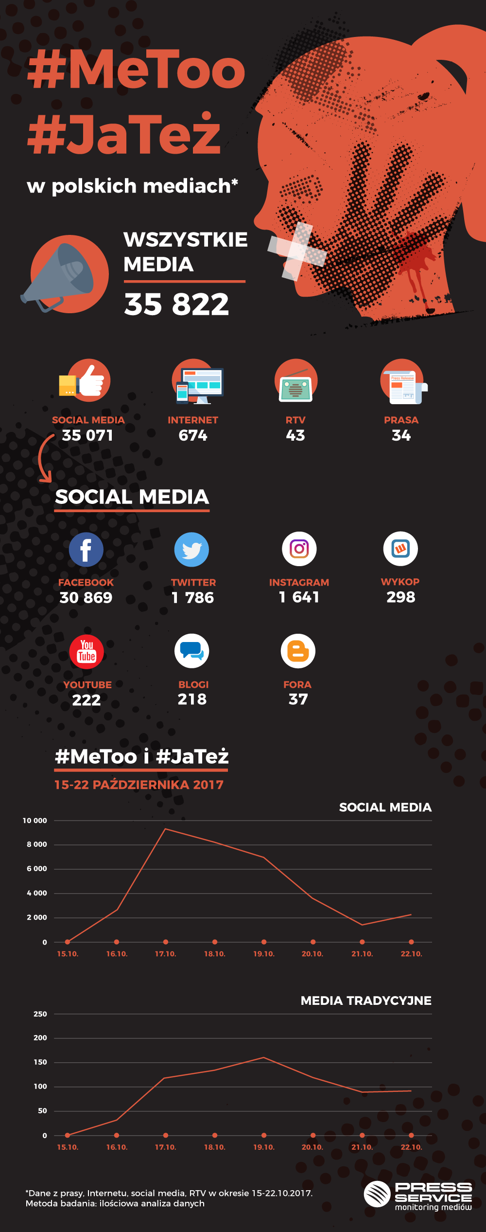 Z analizy „PRESS- SERVICE Monitoring Mediów” wynika, że od 15 do 22 października br. w polskich mediach ukazało się blisko 36 tys. informacji zawierających frazę #MeToo oraz #JaTeż, w tym w social media aż 35 tys.
